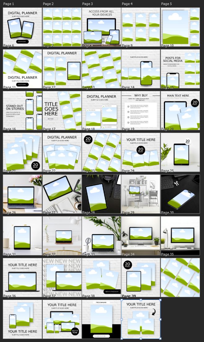 This collection includes thirty-nine unique square listing mockups, each carefully structured to help sellers present their digital products in an organized and conversion-focused way. As shown in the preview image, the mockups cover a wide variety of listing needs, including product covers, digital planner previews, multi-page layouts, bundle displays, feature highlights, “why buy” sections, social media previews, device compatibility visuals, page count callouts, and clean lifestyle desk scenes.