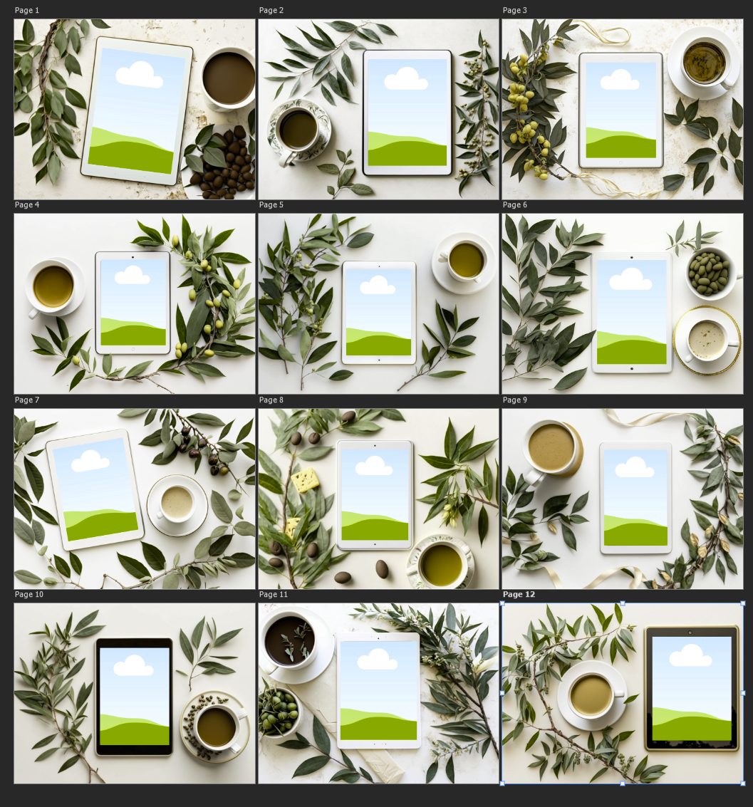 The set includes a variety of tablet orientations and device styles, ensuring flexibility in presentation. Some scenes feature white tablet frames, others darker frames, and each composition uses different arrangements of olive branches and props. This variety allows sellers to present multiple products or variations while maintaining a consistent visual theme.